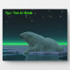 Un momento pacífico en la larga noche ártica. Un oso polar descansa en el borde de un área abierta en el hielo de la manada. Las luces del norte brillan a la distancia; las estrellas brillantes brillan sobre la cabeza. Añade tu propio texto. Los osos polares están en peligro. ¿Cuánto tiempo más podrán ocurrir escenas como esta? Por favor, ayuden a salvar a los osos polares de la extinción.