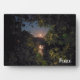 La luna tranquila sobre el agua tranquila es una fotografía original. Sin filtros. Hermoso paisaje lunar a través de frondosas hojas verdes. Cielo azul suave, aura rosa resplandece de la luna, variedad de hojas verdes y amarillas texturadas. Cambia el texto a lo que quieras.