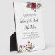 Esta placa de mesa de boda conmemorativa, con sus flores de color burdeos y su mezcla de caligrafía y fuentes simples, es una bella adición a la silla en la que se hubiera sentado en el boda.