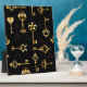 Patrón incomparable de llaves antiguas, doradas y de silueta sobre fondo negro.