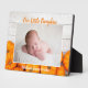 Esta hermosa y moderna placa fotográfica de Acción de Gracias para recién nacidos muestra una fotografía de tu dulce recién nacido con las palabras Nuestra calabaza en naranja. Esta fotografía de otoño de bonito con madera blanca a la moda detrás del parche de calabazas es un elegante regalo de parto para Halloween o el Día de Acción de Gracias.