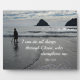 Beautiful rocky coast of Oregon, with waves rolling up on the sand, and person walking in the water with crutches.  Bible Verse is: "I can do all things through Christ, who strengthens me. Philippians 4:13"  Wonderful reminder, for the Christian, that with God, one can overcome obstacles.