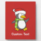 Un pequeño pingüino personalizado con sombrero de santa y bufanda verde caminando sobre la nieve.