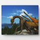 Un dragón se sienta sobre una gran roca que da a un bosque de pinos hacia un lago.