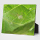 Esta impresionante placa muestra una foto detallada de una pequeña araña de jardín sentada en una hoja de brócoli. La criatura diminuta es casi transparente. La fotografía es tan detallada que incluso se pueden ver un par de hebras de la telaraña.