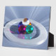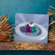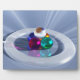 Una imagen en 3D creada en Vue, llena de reflejos y luces brillando desde todas direcciones. Cinco esferas de colores de vidrio azul, rosa, turquesa, naranja y diamante se asientan en una pirámide rodeada por un anillo blanco translúcido. Se sientan sobre un fondo alucinante de rayos azul y blanco pálidos que convergen justo debajo de las cinco bolas de cristal.