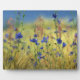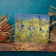 Colores y flores de maíz vivos azules florecen en un campo dorado de césped bajo un cielo azul pálido. El fondo rubio y verde también se ve interrumpido por el rosa brillante de las flores de hierba mojada.