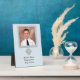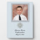 Placa de foto religiosa con suave fondo rayado azul y acento cruzado plateado. Se puede usar para la Primera Santa Comunión, Confirmación, Bautismos o Cristiandad.