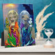 "Sun Child and Moon Child" - una de mis pinturas favoritas hasta la fecha, me encantan los colores de esta. Inspiradas vagamente por la canción "Noonchild" (Mono niño) del rey Crimson -estas hermanas se paran juntas, pero separadamente- representando al sol (a tu izquierda) y a la luna (a tu derecha). El cielo y el mar se muestran aquí reflejando la dicotomía día/noche. Sun Child está acunando un cáliz que contiene la luz del sol, y Moon Child carga un vaso que contiene la luna creciente. Un gallo representa día/mañana y el conejo de luna es para la noche. Esta es una pieza que debuté y vendí en Dragon*Con 2011 - originalmente fue en un marco de retablo diptych (de dos paneles) muy limpio que mi marido Matt hizo para mí. Aunque el original se ha vendido, ¡tengo huellas y otras mercaderías con estas bellezas! Mi propia pintura acrílica original.
