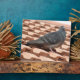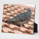 Esta impresionante placa muestra una fotografía de un pichón salvaje sentado sobre un techo. El pichón tiene un hermoso plumaje con baldaquino y se ve muy contento en su percha de la azotea.
