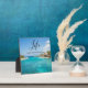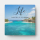 Una placa fotográfica que dice: La vida es mejor en la playa. Diseñado con una bonita foto que muestra un complejo de playa tropical. agua azul bonito y playa de arena blanca con cabañas de paja que le confieren un ambiente tranquilo a la isla.