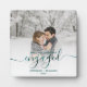 Conmemorar su compromiso con esta hermosa placa moderna de keepsake. El verde azulado texto azul dice "Nuestra primera Navidad comprometida", con la palabra "comprometida" en elegante escritura falsa de escritura a mano de Relieve metalizado con florecientes antes y después. Reemplace la imagen de ejemplo con su foto favorita y agregue sus nombres y el año. Un filtro de degradado blanco ayuda a hacer que el texto aparezca.