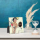 Artista:Joe DeMers | Mujer con un vestido de rayas de cebra y un alfiler de flores rojas inclinado en una silla hablando con un hombre con traje blanco