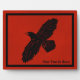 Una silueta simple y negra de un Raven (Corvus corax) sobre una imagen de fondo roja de cuero. La imagen del cuervo ha sido ligeramente "áspera" o "desgastada". Añade tu propio texto.