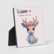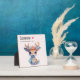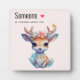Una placa fotográfica con un ilustracion adorable. Un bebe dulce con ojos grandes, cuernos y un pequeño amigo mariposa. Diseño atrevido. El texto dice: Alguien está pensando en ti. Con una pequeña decoración cardíaca. Agradable y caprichoso.