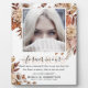 Una hermosa placa conmemorativa de fotografía botánica otoñal para que la exhibas con amor y orgullo en tu hogar. El elegante diseño presenta una foto personalizada de tu ser querido (Consejo de foto: Recorta y cambia el tamaño de la imagen asegurándote de que el sujeto esté en el centro antes de subirla), flores acuarelas otoñales y follaje botánico rústico. El texto es una combinación de letra de caligrafía y fuentes cursivas, todas las cuales se pueden personalizar fácilmente. La cita de condolencias dice - "La muerte deja un dolor que nadie puede curar, el amor deja un recuerdo que nadie puede robar".