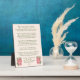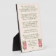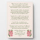 Esta placa de mesa (para la pérdida de una mascota o persona) tiene elegantes flores rosadas con hojas verdes sobre un fondo rosa claro y un poema conmemorativo de un autor desconocido para ayudar a quienes lloran: Cuando me haya ido, déjame ir, suéltame. Tengo tantas cosas que ver y hacer, No debes atarte a mí con demasiadas lágrimas, Pero estate agradecido de que tuvimos tantos años buenos. Te di mi amor, y solo puedes adivinar Cuánto me has dado en felicidad. Te agradezco el amor que me has mostrado, Pero ahora es hora de que siga mi camino solo. Así que llora por mí un rato, si debes llorar, Luego deja que tu dolor sea consolado por la confianza. Es solo por un tiempo que debemos separarnos, Así que atesora los recuerdos dentro de tu corazón. No estaré lejos, la vida sigue. Y si me necesitas, llama y vendré. Aunque no puedas verme o tocarme, estaré cerca. Y si escuchas con tu corazón, escucharás, Todo mi amor a tu alrededor suave y claro. Y luego,