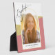 Esta impresionante placa de graduación, de color dorado, cuenta con una foto en arco y se acentúa con el rosa de color y un color de color falso texturizado. La palabra "graduado" aparece en un guión moderno. Este es un recuerdo perfecto para este graduado de este año.