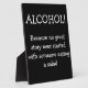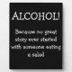 Rótulo Bar con Cita Graciosa ideal para bodas. "Alcohol, porque nunca una buena historia comenzó con alguien comiendo una ensalada". El fondo y el color del texto son personalizables para adaptarse a la decoración.