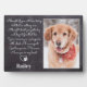 Celebra a tu mejor amigo con una placa de visualización de fotos mascota única y personalizado. Esta placa conmemorativa de fotos de perros es el regalo perfecto para usted, familia o amigos. Cita: "Pensé en ti con amor hoy, pero eso no es nada nuevo que haya pensado en ti ayer y días antes. Tu memoria es mi punto de vista con el que nunca me separaré. Dios te tiene en sus brazos, yo te tengo en mi corazón". Personalizar con la foto del perro favorito, y nombre . Vea 'personalizar esta plantilla' para cambiar la foto y el nombre . Mascota Pérdida Cita Solidaridad Para Mantener El Memorial Del Perro. DERECHOS RESERVADOS © 2020 Judy Burrows, Black Dog Art - Todos los derechos reservados. Mascota ruso regalo conmemorativo simpatía Poema Perro placa de foto