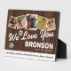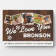 Maqueta conmemorativa de mascota rústico con fondo de papel de madera, 5 fotos de mascotas familiares, un audaz diseño tipográfico de "te queremos", huellas digitales, el nombre del perro/gato y fechas.