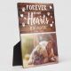 Una placa mascota rústica en memoria para que valores la memoria de tu amado mascota. Con un fondo de madera, el dulce dicho "para siempre en nuestros corazones", una dispersión de corazones blancos y huellas, el nombre y fechas de los mascotas.
