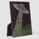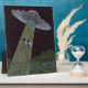 Dibujo a lápiz de color de una desafortunada vaca secuestrada por extraterrestres en un platillo volador en una noche oscura y estrellada. El asustado rebaño se acurruca en el fondo.