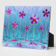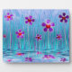 Dibujo digital de flores moradas lindas y estilizadas con brillantes centros rojos. Te miran curiosamente desde la hierba alta junto a una piscina de agua transparente.