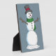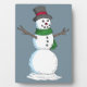 Un muñeco de nieve alegre pero con aspecto frío lleva un sombrero de copa roja y una bufanda verde en este ilustracion invernal de Richard H. Fay.