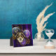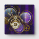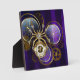 Araña de acero de oro y acero con relojes antiguos decorados con artes dorados sobre el fondo morado, rayado, texturado con lentes y engranajes de latón. Estilo Steampunk.