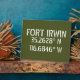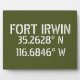 Coordenadas de mapas de latitud y longitud para Fort Irwin, situado en el desierto cerca de Barstow, fuente blanca estilo esténcil de California sobre fondo verde del ejército.
