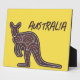 La placa de tabletop presenta silueta de canguro en un patrón de mosaico aborigen sobre fondo amarillo con "Australia" en texto de estilo grunge