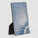 Esta placa de mesa (para la pérdida de una mascota o persona) tiene una hermosa imagen de un cielo azul con una nube blanca esponjosa y luz solar, y un poema conmemorativo de un autor desconocido para ayudar a consolar a aquellos que han perdido a un ser querido: Te pensé con amor hoy, Pero eso no es nada nuevo. Te pensé ayer Y días antes también. Pienso en ti en silencio, A menudo digo tu nombre. Todo lo que tengo son recuerdos Y tu foto en un marco. Tu memoria es mi recuerdo Con el que nunca me separaré. Dios te tiene en su cuidado, Yo te tengo en mi corazón.