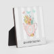 Una placa fotográfica personalizada con un nombre. Con un ilustracion caprichoso. Una tetera rosa con un pequeño corazón rosado en el centro y un ramo de flores en el interior. Delicadas mariposas de colores pastel revolotean por todas partes. Sobre un fondo rayado gris y blanco.