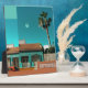 Una foto colorida de un pueblo español con un edificio tradicional, una luna creciente y una palmera. Valencia, Alicante.