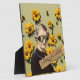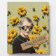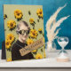 La placa de la mesa de cartón de color kitschy presenta un tintado recorte fotográfico de la mujer de los años 30 con gafas de vapor añadidas, una cadena de perlas, una cinta de washi con texto "pionero" en el fondo de coloridas margaritas amarillas