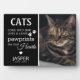 Si tuvieras un gato al que amabas y adorabas, esta bonita placa conmemorativa de un mascota que muestra una foto de tu mascota es un placer para ti y para la familia. Tiene una cita de simpatía que dice "Los GATOS entran a nuestras vidas y dejan huellas en nuestros corazones", un par de huellas digitales, un corazón, el nombre de sus mascotas y fechas