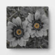 A pair of delicate daisies take centre stage in this striking selective‑colour photograph. The petals and surrounding foliage are rendered in smooth grayscale, creating a calm, monochrome backdrop. At the heart of each bloom, vivid yellow‑orange centres burst with warmth and detail, forming a dramatic contrast that immediately draws the eye. Fine water droplets rest on the petals and leaves, adding texture and a sense of freshness. The combination of soft tones and vibrant colour accents gives the artwork a modern, elegant feel that suits home décor, nature lovers, and contemporary art collections.