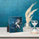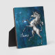 Hermoso ilustracion unicornio de estilo herálgico vintage situado sobre el fondo celeste del cielo. Personalizar con nombre u otro texto con tipo de letra de script blanco.