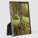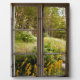 Flores amarillas, hierba verde y árboles. Bonita naturaleza fuera de una vieja ventana. Fotografía.