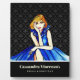Diseñado en base a mi ilustración de una hermosa dama de cabello rubio que lleva un impresionante vestido de cóctel clásico elegante de color azul real oscuro con patrón de damasco negro y gris en el fondo. El diseño tiene textos personalizables en el lado derecho. Personalízalo en mi tienda para un diseño personalizado.