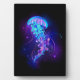 Gran medusa azul, de dibujo artístico, brillante y brillante, con largos tentáculos sobre fondo negro con bioluminiscencia violeta. Luminosas medusas.