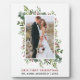 Moderno y elegante Minimalista Nuestra primera placa de fotografía Boda de Navidad recién casada incluye Elegante vegetación acuática, hojas de eucalipto y bayas holly.