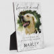 Elegante placa fotográfica conmemorativa de mascota con fondo de mármol falso, una imagen de su perro o gato, huellas de patas, la frase 'siempre extrañado' que incorpora un corazón, su nombre, fechas de nacimiento y fallecimiento, y la expresión de condolencia 'si pudiera haberte salvado, vivirías por siempre'.