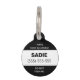 Difundir la conciencia de las alergias alimentarias de un perro. La silueta original ilustrada de Destei de la cabeza de un perro negro que se parece a un Golden Retriever y razas similares con orejas disquetas. En la parte superior se puede leer "¡Alerta alérgica!" y en la parte inferior: "¡Sobre una dieta estricta!". En el otro lado hay áreas de texto personalizables para un nombre y un número de teléfono. También hay dos áreas de texto personalizables que ahora dicen: "¡Tengo alergias a alimentos!" y "¡No me alimentes!". La combinación de colores es en blanco y negro.