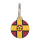 Etiqueta de mascotas con diseño con una bandera del condado histórico de Northamptonshire, en Inglaterra, Gran Bretaña; bandera marrón con una cruz de oro y el rosa tradicional del condado en el centro