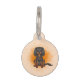 El original ilustracion personalizado de Destei de un lindo color negro y marrón Cavalier Rey Carlos español perro de raza que está sentado. Detrás del perro hay un toque de color naranja. El color de fondo es naranja. En el otro lado hay áreas de texto personalizables para un nombre y un número de teléfono.