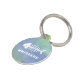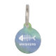 El diseño de esta etiqueta de identificación de mascotas presenta un gradiente de color agua adorable de azules y verdes, con un símbolo de hueso de pescado prominente en blanco en el centro, complementado con el nombre de sus mascotas en un tipo de letra blanco coincidente. La combinación de colores frescos e imágenes lúdicas hacen de esta etiqueta una elección adorable para un mascota, especialmente un gato, dada la asociación clásica entre gatos y su afición por el pescado. La mezcla suave de colores ofrece un efecto relajante, elegante y funcional como forma de identificación mascota.