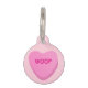 Adorne a su dulce perro con esta etiqueta de perro con corazón de caramelo rosa para celebrar cuánto lo ama. Corazón de conversación rosa con WOOF en un fondo rosa claro. Personalizado en el reverso con el nombre de su perro, su nombre e información de contacto. Disponibles collares y correas a juego para completar su conjunto del Día de San Valentín.