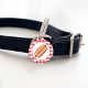 Ilustración de comida rápida de Destei de un pan de perrito caliente con una salchicha a la parrilla que tiene algo de kétchup y mostaza encima. El fondo tiene un patrón de cuadros rojos. Al otro lado hay dos áreas de texto personalizables donde una es ideal para el nombre de la mascota, mientras que la otra podría utilizarse para el número de teléfono del dueño.
